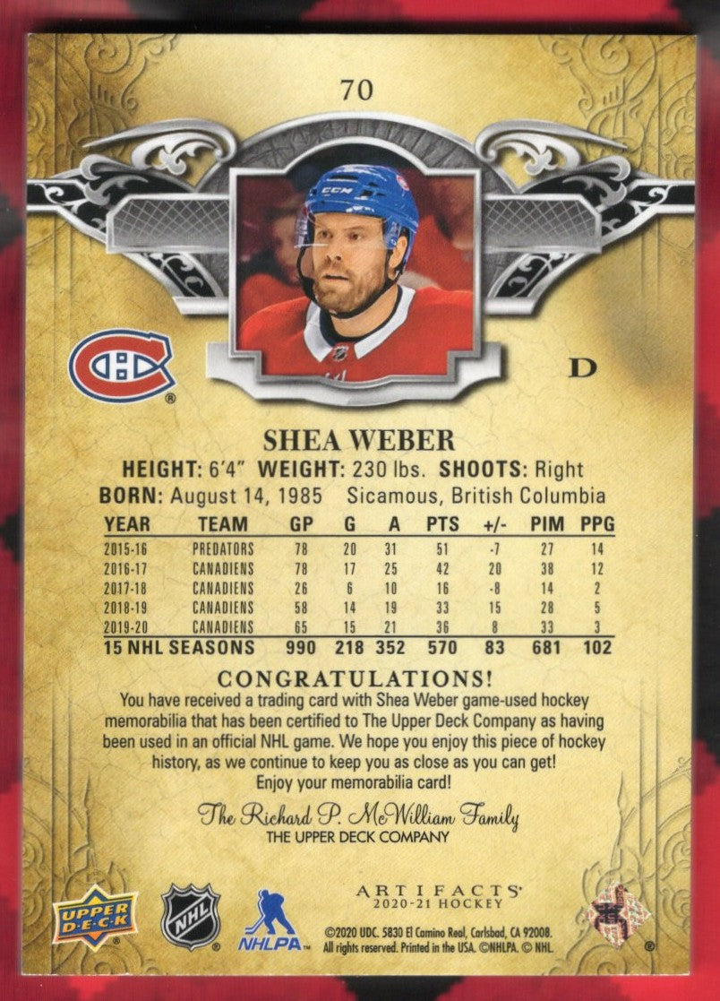 top2020-21 Upper Deck Artifacts Hockey Dual Patch Emerald #70 Shea Weber /65