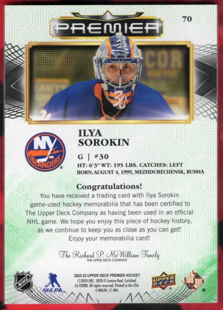 top2022-23 Upper Deck Premier Fight Strap #70 Ilya Sorokin (5)/5