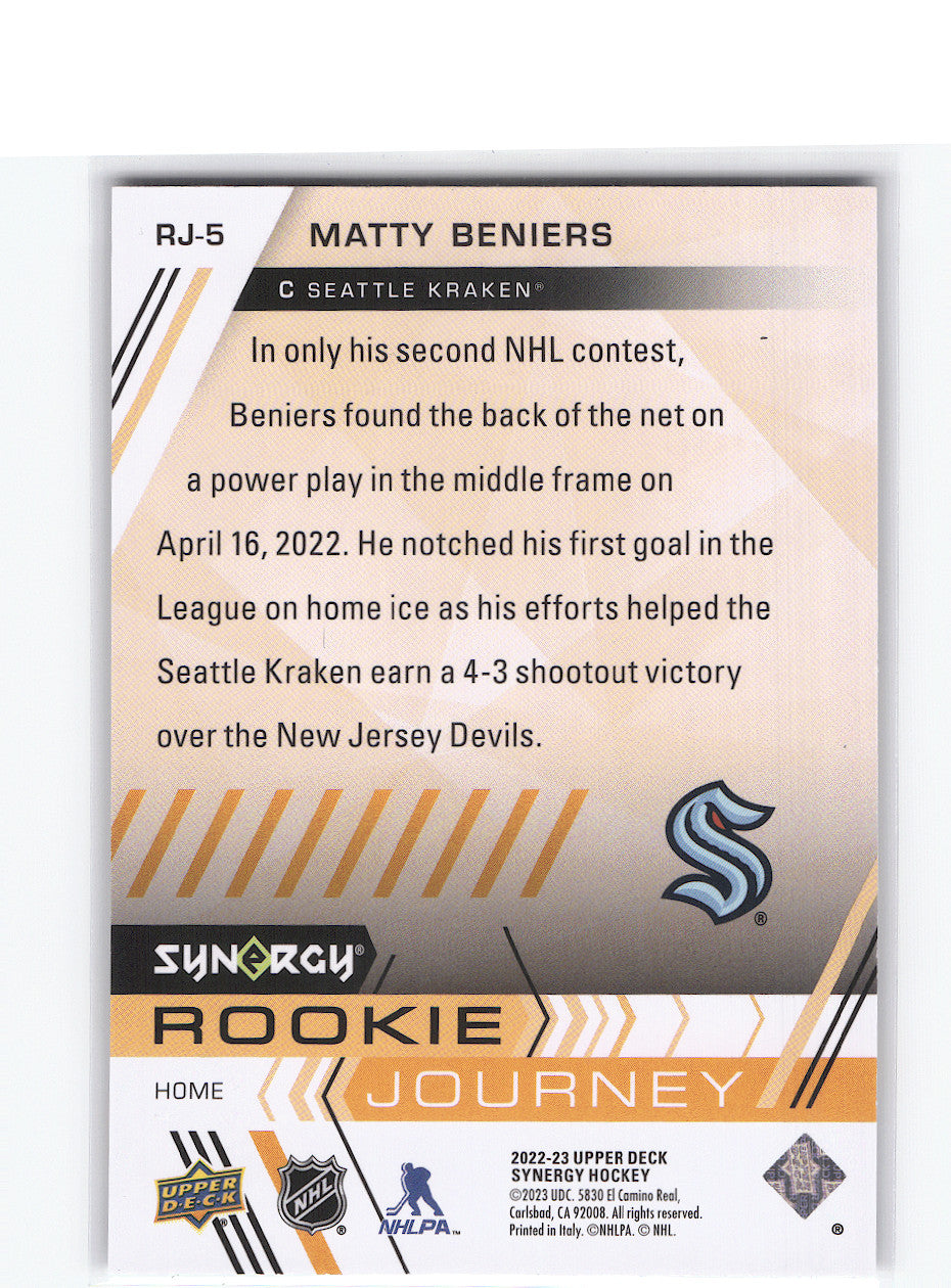 top2022-23 Upper Deck Synergy Rookie Journey Rj-5 Rookie Rc Matty Beniers /99