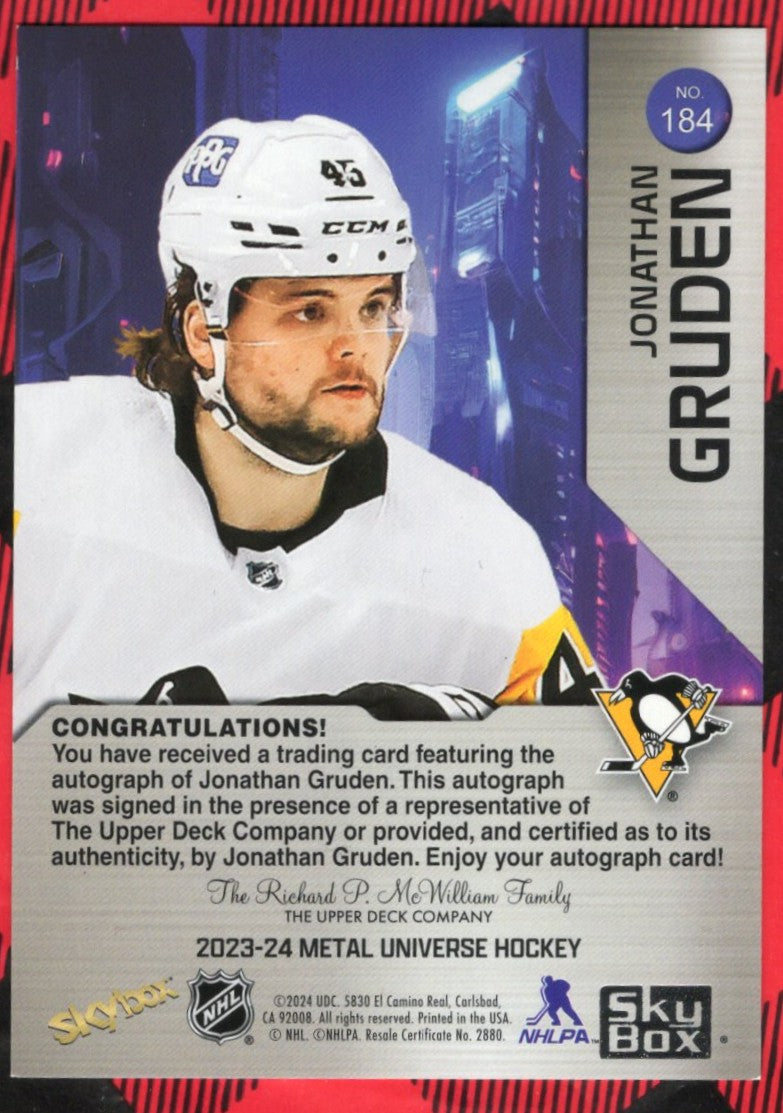 top2023-24 Skybox Metal Universe Rookie Auto #184 Rookie Rc Auto Jonathan Gruden /399