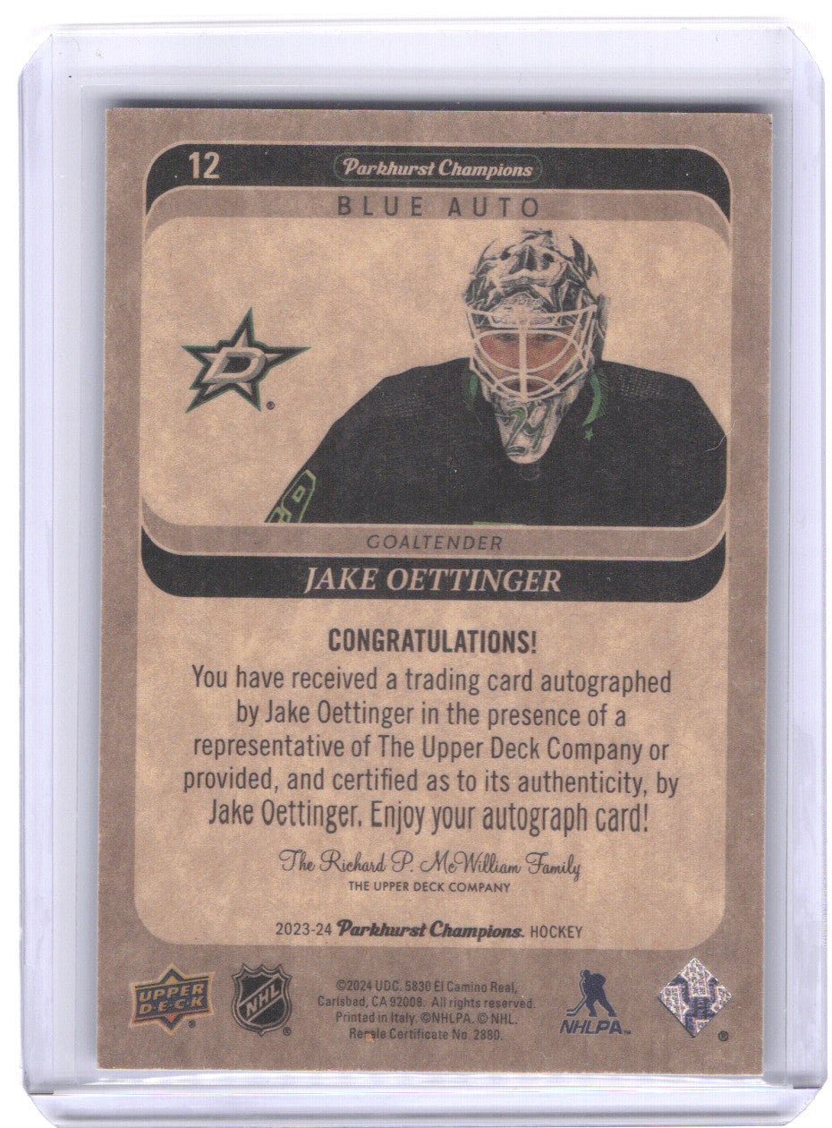 top2023-24 Upper Deck Parkhurst Champions Blue Auto #12 Auto Jake Oettinger /15
