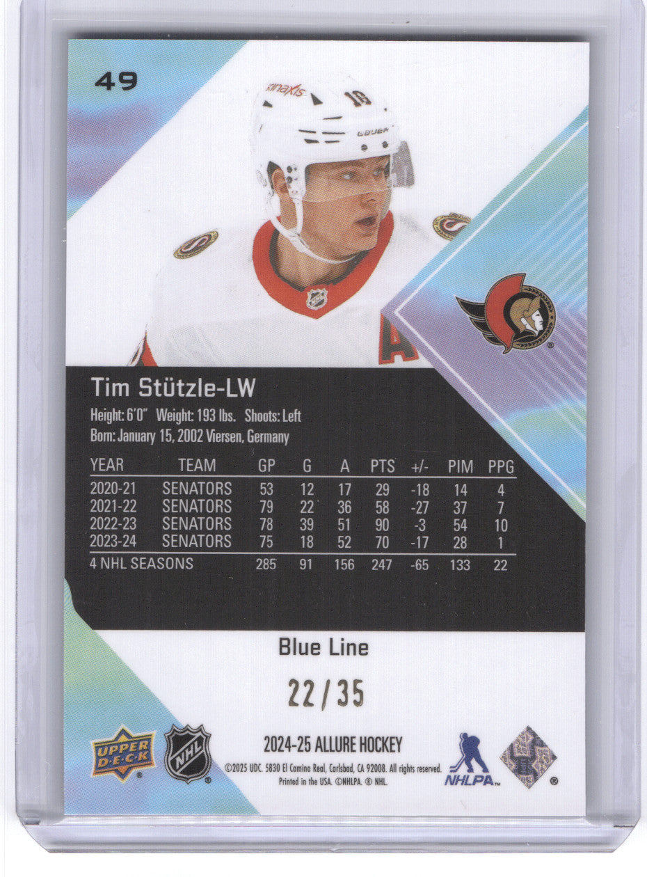 top2024-25 Upper Deck Allure Blue Line #49 Tim Stutzle
