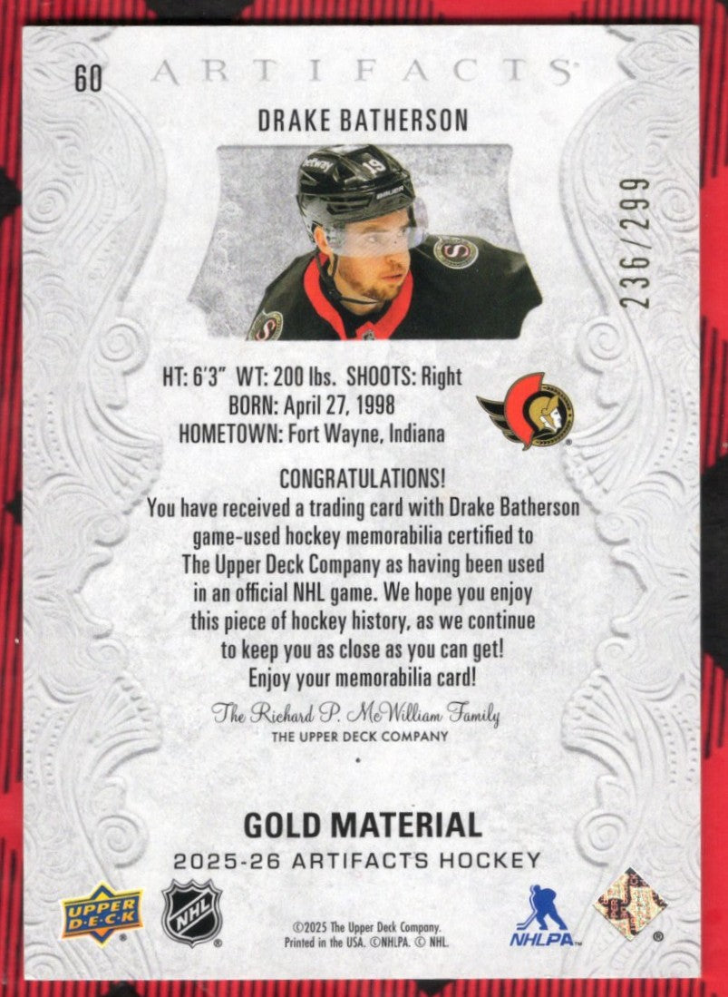2024-25 Upper Deck Artifacts Gold Material #60 Drake Batherson /299