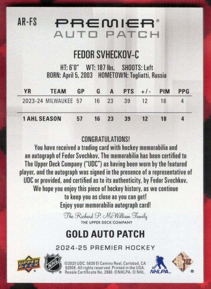 top2024-25 Upper Deck Premier Hockey Premier Gold Auto Patch Ar-Fs Rookie Rc Auto Fedor Svheckov /65