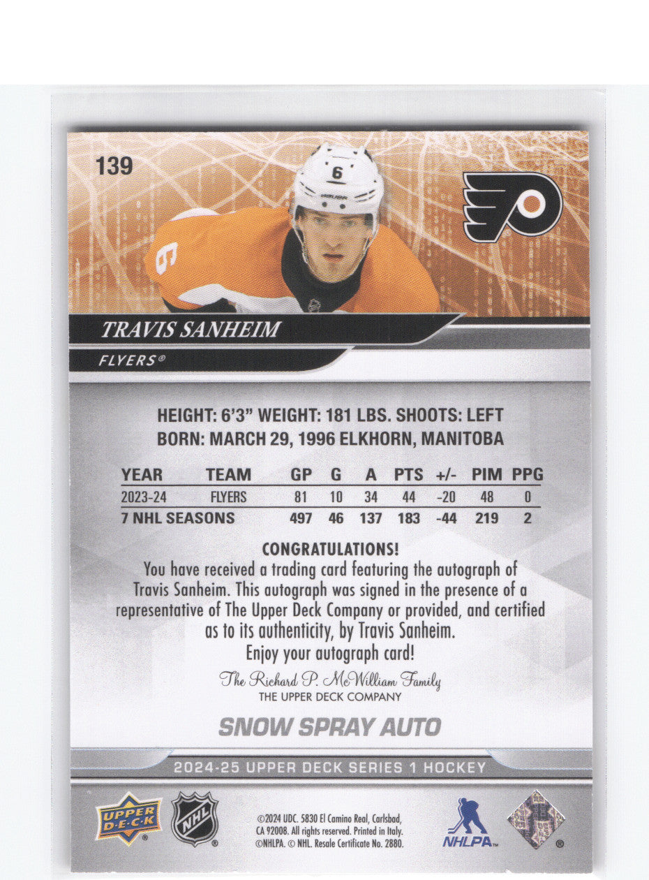 top2024-25 Upper Deck Series 1 Snow Spray #139 Auto Travis Sanheim