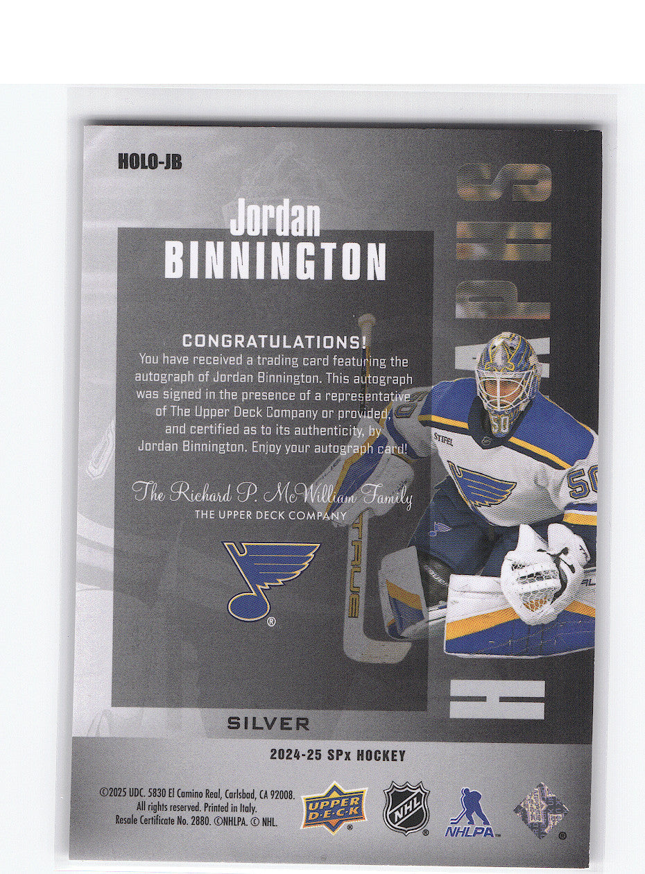 top2024-25 Upper Deck Spx Holographs Holo-Jb Auto Jordan Binnington