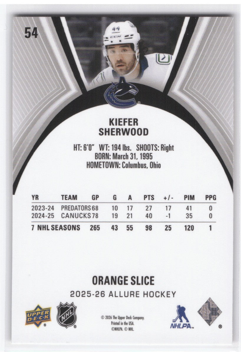 top2025-26 Upper Deck Allure Orange Slice #54 Kiefer Sherwood