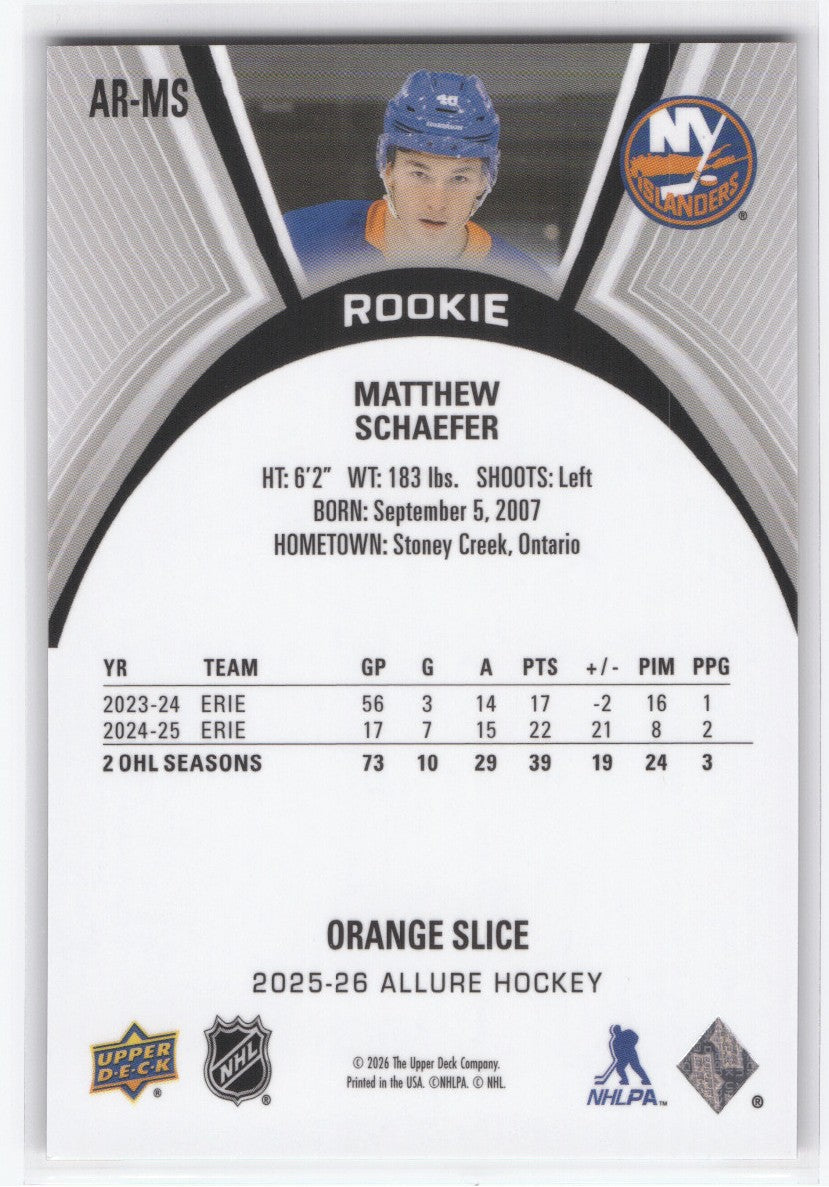 top2025-26 Upper Deck Allure Orange Slice Rookie Ar-Ms Rookie Rc Matthew Schaefer
