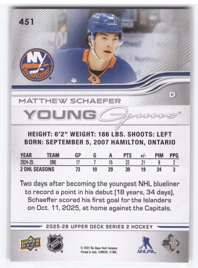 top2025-26 Upper Deck Series 2 Young Guns #451 Rookie Rc Matthew Schaefer