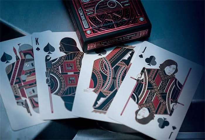 Both decks have the same set of 12 court cards, with iconic light side and dark side characters. Each card features detailed depictions of these iconic characters. On the dark side, Palpatine is depicted alongside Kylo Ren, Darth Vader and more, and on the light side: Rey, Leia Organa, Han Solo, Luke Skywalker, and more. The cards themselves are made in the USA - printed on FSC-certified paper derived from sustainable forests, vegetable-based inks, and starch-based laminates.