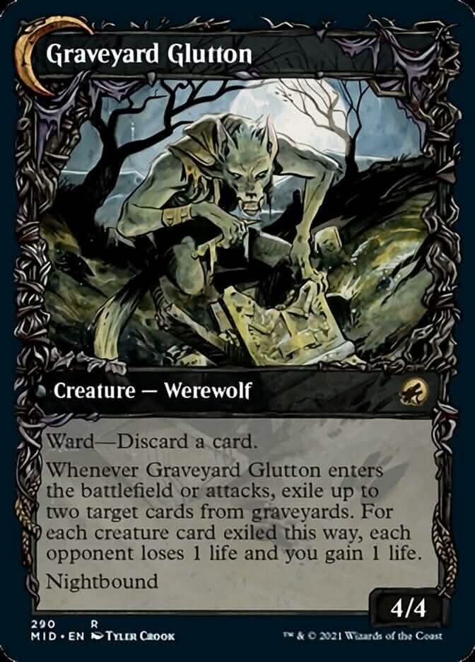 DayboundReverse Type: Creature — Werewolf Ward—Discard a card Whenever Graveyard Glutton enters the battlefield or attacks, exile up to two target cards from graveyards. For each creature card exiled this way, each opponent loses 1 life and you gain 1 life. NightboundRefund Policy: