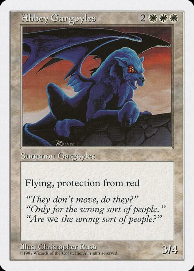 Regular Price $0.50Hurry! Only0units left in stock!STANDARD PRODUCT SHIPPINGIf you are purchasing a item that is not a Trading Card Single, you must choose the Expedited Shipping option. Failure to do so will result in a invoice for shipping or order cancellation.DISCOUNTED SHIPPINGAll TCG Singles orders over $100 will ship for a discounted rate. They will all be sent expedited with tracking in a bubble mailer and very well protected.CONTACT USYou can reach us anytime via our Facebook messenger or via email - charlottetown@exorgames.comSet: Fifth Edition Type: Creature — Gargoyle Rarity: Uncommon Cost: {2}{W}{W}{W} Flying, protection from red"They don't move, do they?" "Only for the wrong sort of people." "Are *we* the wrong sort of people?"Refund Policy: