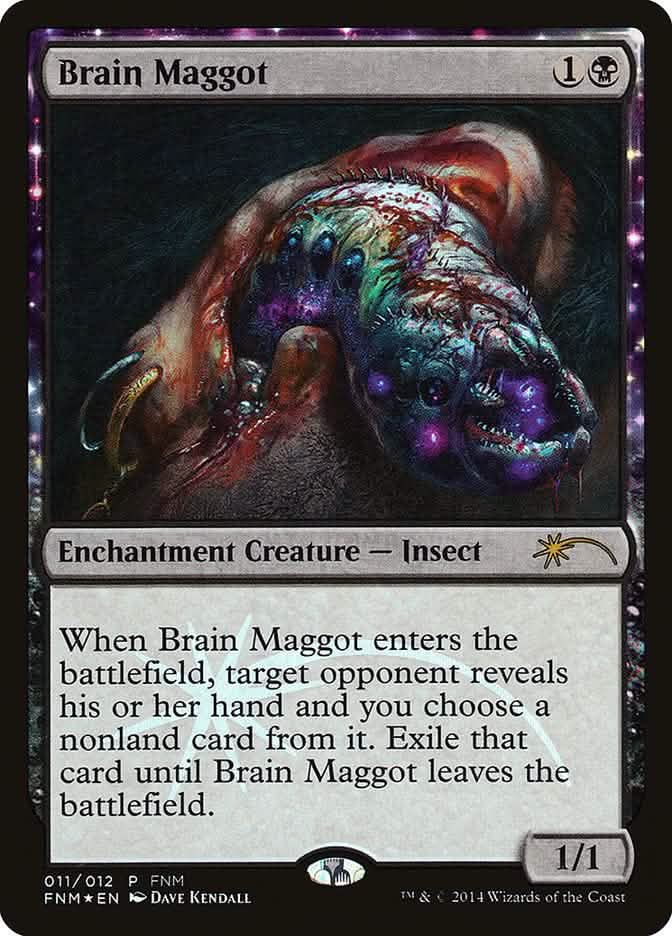 Regular Price $1.00Hurry! Only2units left in stock!STANDARD PRODUCT SHIPPINGIf you are purchasing a item that is not a Trading Card Single, you must choose the Expedited Shipping option. Failure to do so will result in a invoice for shipping or order cancellation.DISCOUNTED SHIPPINGAll TCG Singles orders over $100 will ship for a discounted rate. They will all be sent expedited with tracking in a bubble mailer and very well protected.CONTACT USYou can reach us anytime via our Facebook messenger or via email - charlottetown@exorgames.comSet: Friday Night Magic 2014 Type: Enchantment Creature — Insect Rarity: Rare Cost: {1}{B} When Brain Maggot enters the battlefield, target opponent reveals their hand and you choose a nonland card from it. Exile that card until Brain Maggot leaves the battlefield.Refund Policy: