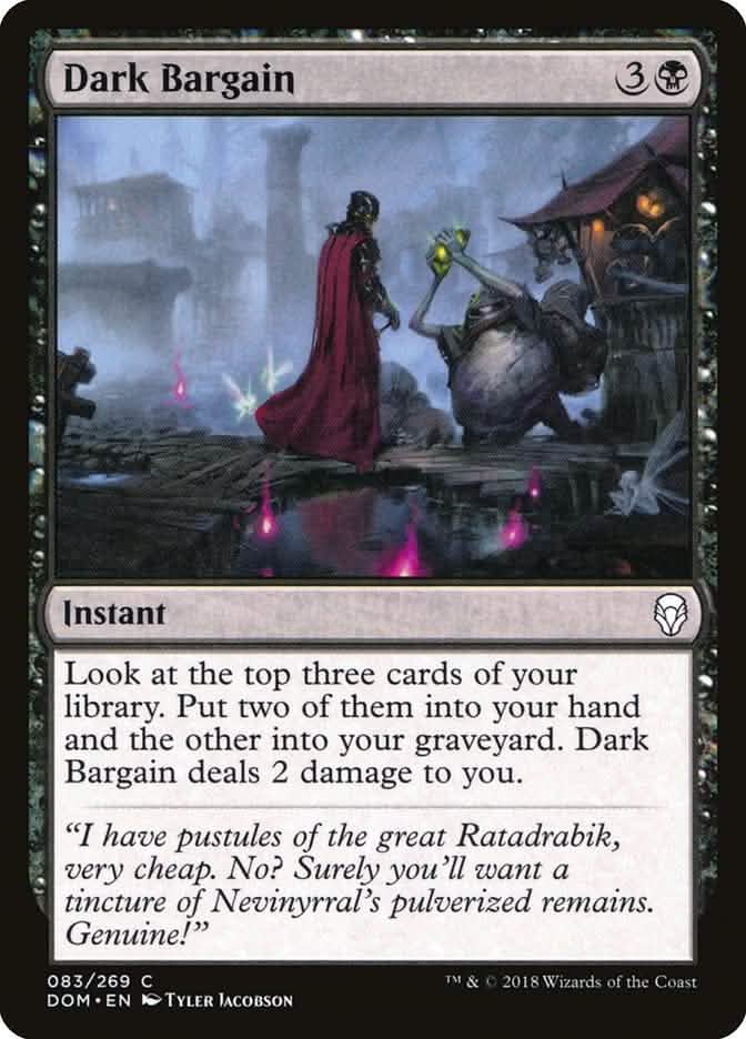 Regular Price $0.25Hurry! Only47units left in stock!STANDARD PRODUCT SHIPPINGIf you are purchasing a item that is not a Trading Card Single, you must choose the Expedited Shipping option. Failure to do so will result in a invoice for shipping or order cancellation.DISCOUNTED SHIPPINGAll TCG Singles orders over $100 will ship for a discounted rate. They will all be sent expedited with tracking in a bubble mailer and very well protected.CONTACT USYou can reach us anytime via our Facebook messenger or via email - charlottetown@exorgames.comSet: Dominaria Type: Instant Rarity: Common Cost: {3}{B} Look at the top three cards of your library. Put two of them into your hand and the other into your graveyard. Dark Bargain deals 2 damage to you."I have pustules of the great Ratadrabik, very cheap. No? Surely you'll want a tincture of Nevinyrral's pulverized remains. Genuine!"Refund Policy: