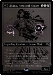 Whenever another nontoken creature you control dies, exile Liliana, Heretical Healer, then return her to the battlefield transformed under her owner's control. If you do, create a 2/2 black Zombie creature token.Reverse Type: Legendary Planeswalker — Liliana +2: Each player discards a card. −X: Return target nonlegendary creature card with converted mana cost X from your graveyard to the battlefield. −8: You get an emblem with "Whenever a creature dies, return it to the battlefield under your control at the beginning of the next end step."Refund Policy: