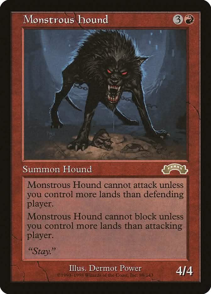 Monstrous Hound can't block unless you control more lands than attacking player."Stay."Refund Policy: