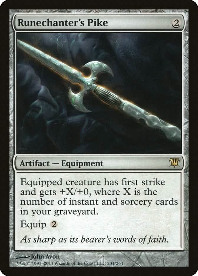 Regular Price $0.91Hurry! Only1units left in stock!STANDARD PRODUCT SHIPPINGIf you are purchasing a item that is not a Trading Card Single, you must choose the Expedited Shipping option. Failure to do so will result in a invoice for shipping or order cancellation.DISCOUNTED SHIPPINGAll TCG Singles orders over $100 will ship for a discounted rate. They will all be sent expedited with tracking in a bubble mailer and very well protected.CONTACT USYou can reach us anytime via our Facebook messenger or via email - charlottetown@exorgames.comSet: Innistrad Type: Artifact — Equipment Rarity: Rare Cost: {2} Equipped creature has first strike and gets +X/+0, where X is the number of instant and sorcery cards in your graveyard.