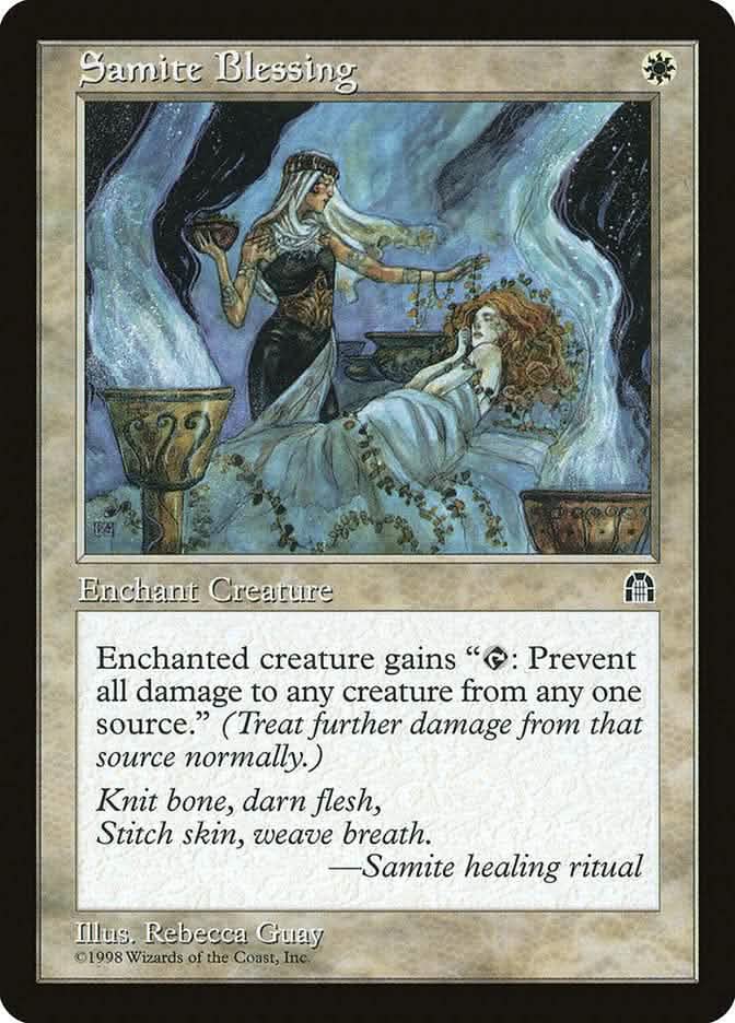 Enchanted creature has "{T}: The next time a source of your choice would deal damage to target creature this turn, prevent that damage."Knit bone, darn flesh, Stitch skin, weave breath. —Samite healing ritualRefund Policy: