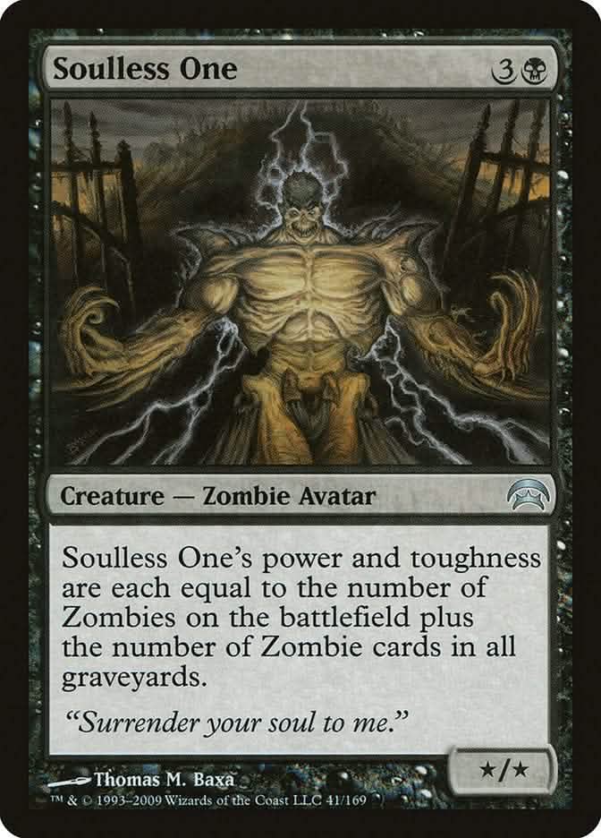 Regular Price $2.65Hurry! Only0units left in stock!STANDARD PRODUCT SHIPPINGIf you are purchasing a item that is not a Trading Card Single, you must choose the Expedited Shipping option. Failure to do so will result in a invoice for shipping or order cancellation.DISCOUNTED SHIPPINGAll TCG Singles orders over $100 will ship for a discounted rate. They will all be sent expedited with tracking in a bubble mailer and very well protected.CONTACT USYou can reach us anytime via our Facebook messenger or via email - charlottetown@exorgames.comSet: Planechase Type: Creature — Zombie Avatar Rarity: Uncommon Cost: {3}{B} Soulless One's power and toughness are each equal to the number of Zombies on the battlefield plus the number of Zombie cards in all graveyards."Surrender your soul to me."Refund Policy: