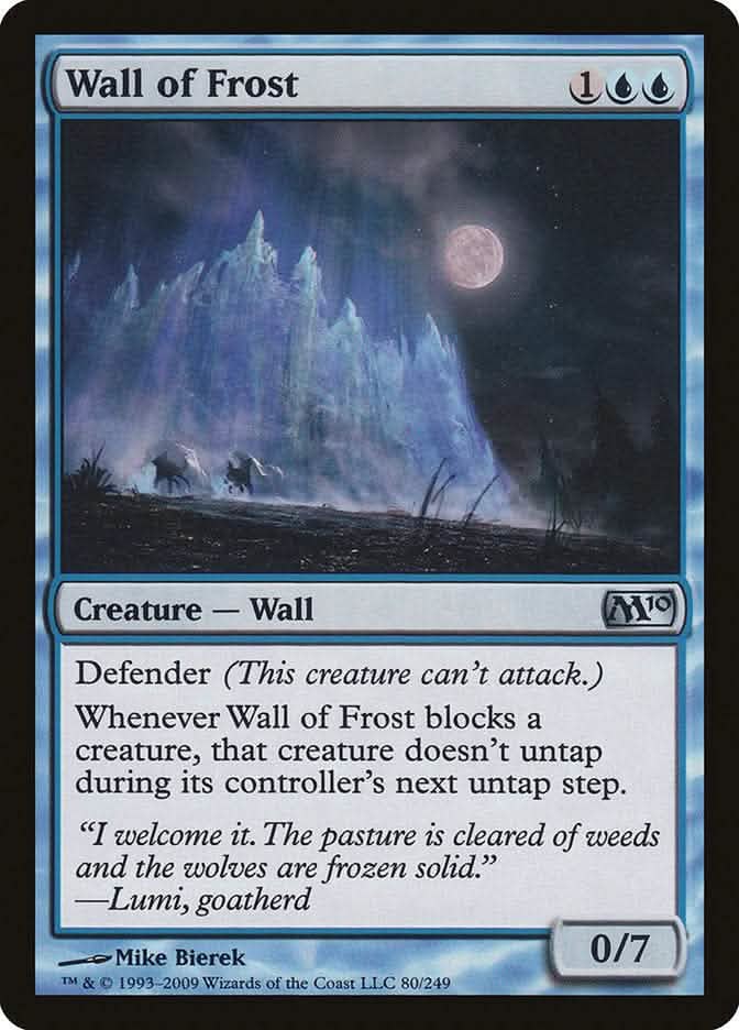 Whenever Wall of Frost blocks a creature, that creature doesn't untap during its controller's next untap step."I welcome it. The pasture is cleared of weeds and the wolves are frozen solid." —Lumi, goatherdRefund Policy: